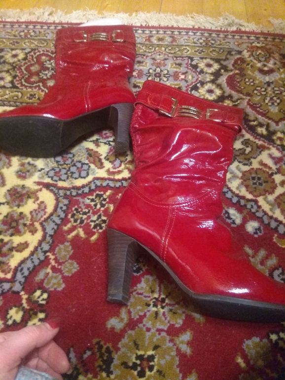 Сапоги красные лаковые натур кожа. Состояние очень хорошее. 37 размер. Цвет ближе к темно-красному. Каблук порядка 6см. Устойчивые.
