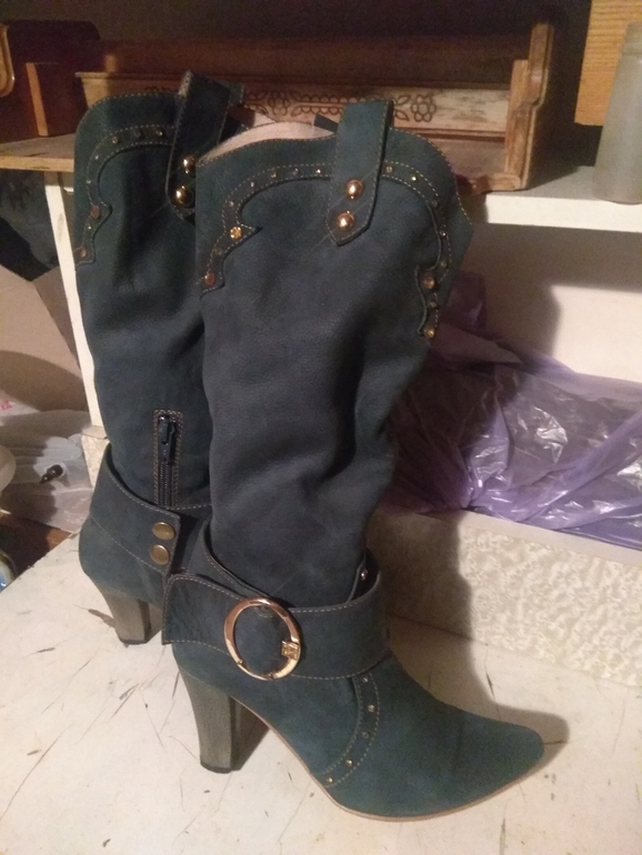 Сапоги натур замша или что-то типа того. Деми. Качественные. цвет пыльный темно-синий. Мне отдавала девочка тут на ББ. 36 размер. Каблук устойчивый порядка 6см. Оригинальные. Камушки сама доклеивала недостающие.