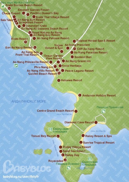Вот карта. Ао Нанг наверху, а Рейлей внизу. И там и там много отелей, но Ао Нанг более тусовочное место)