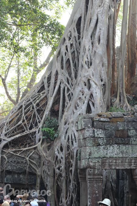Второй храм, в которм мы были - Та Прум. Основная особенность его в том, что его не очищали долгое время от зарослей джунглей.И сейчас он в некоторых местах предстает несущим на себе печать необыкновенной красоты, здесь вся поверхность покрыта плащом из древесных корней и буйной зелени.
