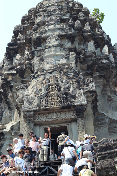 И, пожалуй, основная достопримечательность Камбоджи, то самое из-за чего большинство и едет в эту страну - храмовый комплекс Ангкор Ватт, посторенный более тысячи лет назад.... Строился он в течение многих веков и многими правителями. Версий о создании храмого комплекса множество, вплоть до инопланетного возникновения..... До сих пор многое ученые не могут объяснить - как было сделано то или это, откуда взяли материалы, каким образом обработали и тому подобное. Многие технологии даже в наше время еще недоступны человеку, а как же тогда люди в то далекое время смогли это сделать?????? К слову, до середины 20 века камбоджийцы вообще отрицали свою причастность к постройке данного комплекса, а, видимо поняв, что на этом можно заработать огромные деньги, стали говорить, что "Да, это мы-кхмеры, его построили". А обнаружен данный комплекс был относительно недавно, лишь в 19 веке, в зарослях джунглей. И до сих пор ведутся реставрационные работы. Территория храмового комплекса составляет более 200 кв. км, насчитывает около 300 храмов и лишь 150 открыты к осмотру. А исследования свидетельствуют о том, что когда-то территория могла составлять до 3000 кв. км, а население достигало полумиллиона жителей, благодаря чему он был одним из самых крупных человеческих поселений доиндустриальной эпохи. К слову, надо сказать, что мы за 7 часов смогли осмотреть лишь 3 храма. Кстати, Ангкор Ватт изображен на флаге Камбоджи.