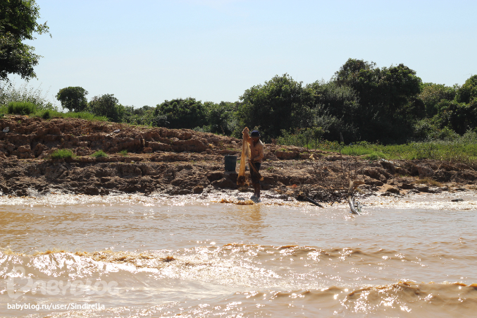 Вода такого цвета из-за ила, якобы если ее набрать в ведро и отстоять, то она станет прозрачной. Озеро просто огромное - берегов не видно, а жителей там порядка нескольких тысяч: