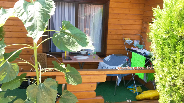 В домиках были и минусы (куда ж без этого). Если ты на 1 этаже в 2-х этажном, то по дощатым полам второго очень слышно, как топают. Но нам как-то не мешало и сын ни разу не проснулся. Если ты на втором этаже, то веранды нет. На первых этажах везде в домиках плитка. Но в жару это не мешало, тем более, что там есть коврики.