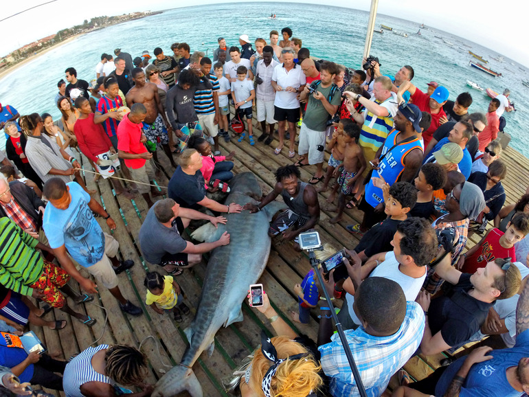 На обратном пути замечаем на пирсе толпу людей и идем посмотреть, что там происходит. Я ожидала увидеть что угодно, но только не 3-метровую акулу, еще дергающуюся, пойманную только что местными рыбаками. С одной стороны, умирающую рыбину жалко, а с другой - она бы при встрече со мной один на один явно подобных чувств бы не испытывала...