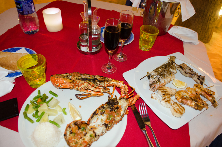Заказываем лобстера и ассорти морепродуктов на гриле. Внезапно понимаю, что на этом праздничном столе мне не хватает икры, оливье, мандаринов, а также елки и снега... И родных. Все-таки Новый год - семейный праздник, и лучше отмечать его дома, и только потом ехать куда-то.