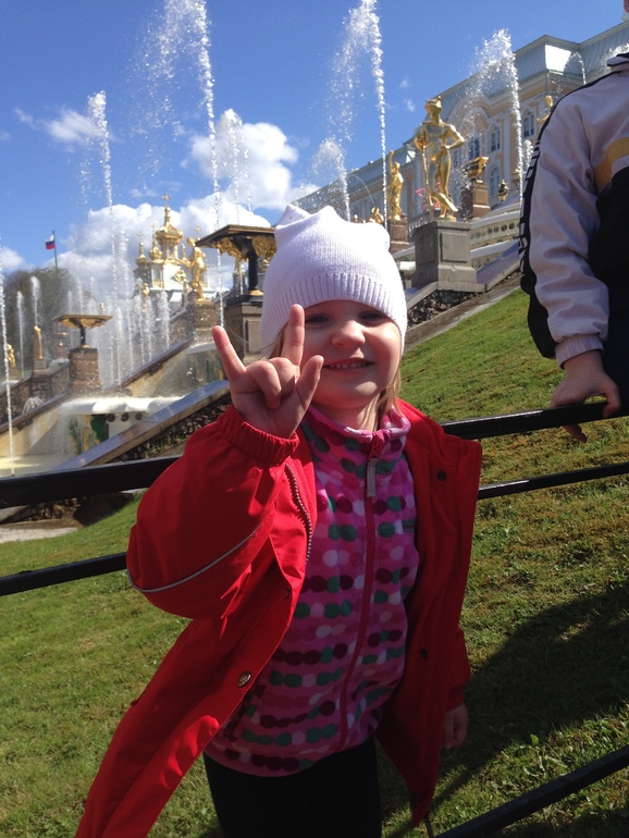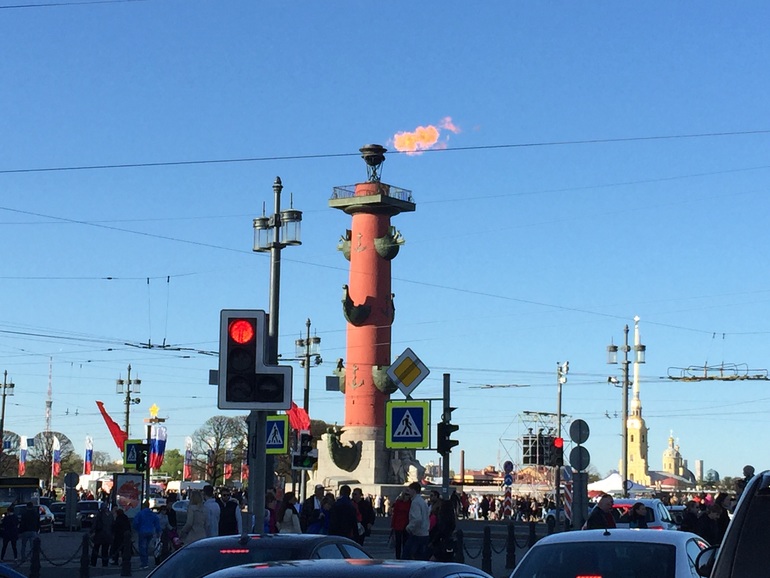 В третий день, 9 мая, нам всем вдруг стало лень бежать на парад. Поэтому парад мы посмотрели по телевизору в отеле. А после парада, когда солнце уже уверенно светило в окна, было решено отправиться в Петергоф. Там планировались праздничные мероприятия по случаю Дня Победы - фейерверк и авиа-шоу. Мы успели как раз вовремя - и фейерверк посмотрели, и оркестр послушали, и авиа-шоу увидели. А еще побегали за белками и утками по лужайкам парка. Посмеялись, пробегая под фонтаном-шутихой. Нагулялись и налюбовались местными красотами. После пятичасовой прогулки решили, что пора домой. Проезжая по городу, увидели зажженные в честь Дня победы ростральные колонны - увенчанные огнями они смотрелись очень торжественно.