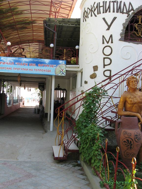 Рядом с шашлычной у Володи, справа от входа на причал Фрунзе, есть ресторан «Керкинитида». Точнее на первом этаже они работают как столовая (мы не кушали, но внешне мне понравилось), а на втором как ресторан. Мы кушали на втором этаже, на террасе с видом на море. Готовят хорошо и вкусно. Но есть одно «но» - ресторан «ориентирован» на вечерних посетителей. Днем там работают один повар и одна официантка. Нам пришлось ждать 40 мин, пока нам начали подавать еду. А с учетом того, что мы и дети были голодными, это несколько напрягло. Так что лучше приходить сюда вечером)