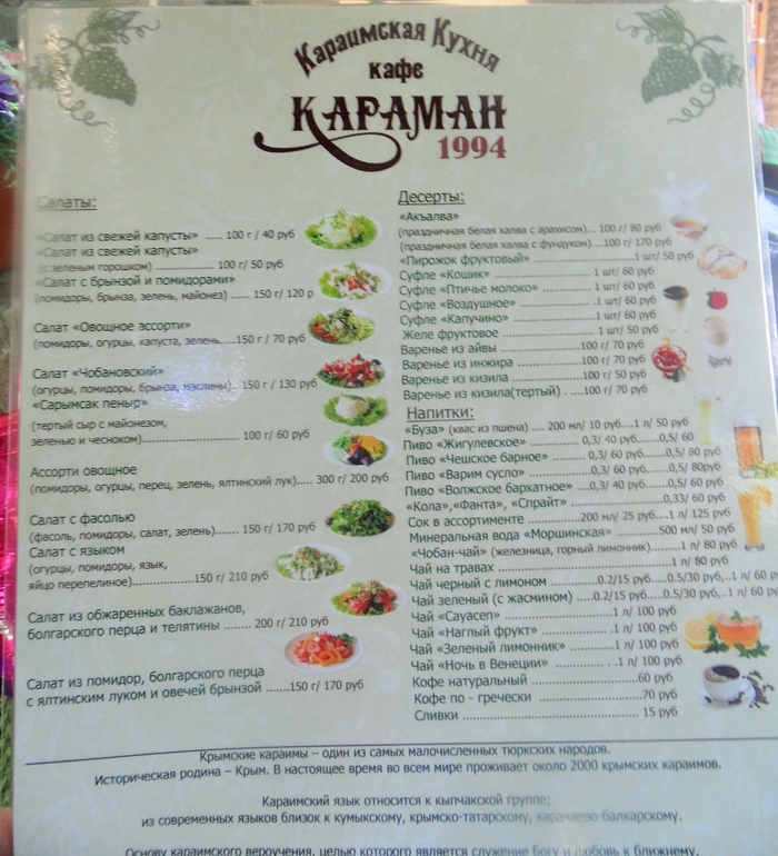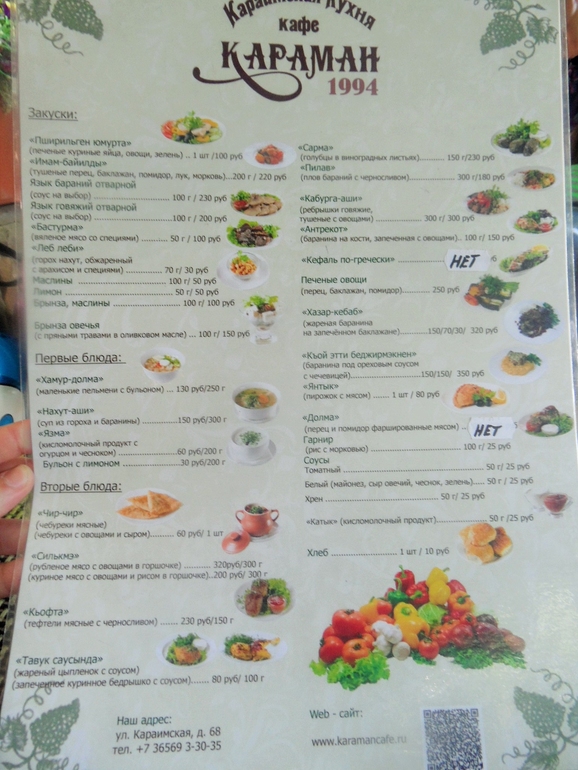 Кафе «Караман»находится рядом со входом в Караимские кенасы в старом городе. Туда приятно прогуляться от Гёзлёвских ворот по узким старинным улочкам, мимо сувенирных лавок. Советую попробовать «Хамур-долма» - вкуснющий бульон с маленькими, приготовленными вручную, пельмешками. Это блюдо подойдет и детям. Мои уплетали за обе щеки. «Хазар-кебаб» - нежнейшая баранина с баклажаном. «Чир-чир» - сочные чебуреки. А на десерт «Акъалва» - праздничная белая халва с фундуком. Есть еще с арахисом, но с фундуком вкуснее))
