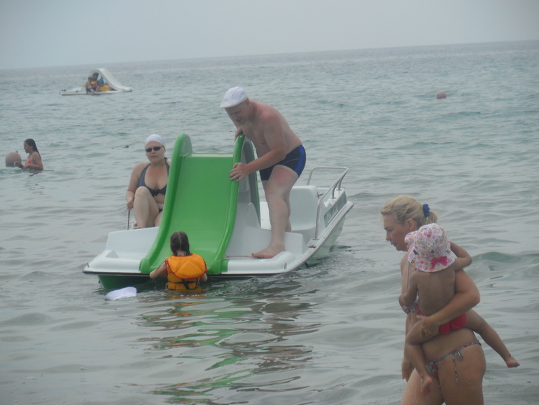 Прокат катамаранов 350 руб/30 мин, 400 руб/час. Мы брали разок - вот такой катамаран с горкой: