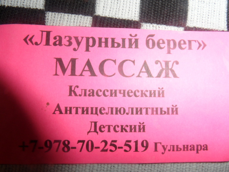 Кума ходила к ней на массаж. Правда Гульнара на пляже не каждый день, так как она работает еще медсестрой в одном из детских санаториев, а на пляже в свободные от дежурства дни. Цены на массаж: