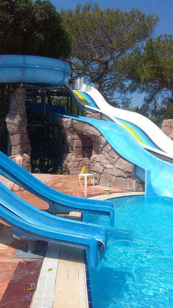 На территории есть бассейн, с горками. Чистый, не пахнет хлоркой. Пару горок, работали по расписанию, что не очень удобно было, но очередей не было
