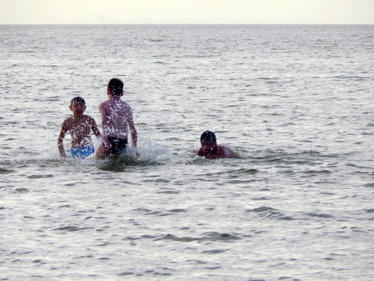 На автобусе ездили на центральный пляж. Народа много, достаточно глубоко. Песок.
