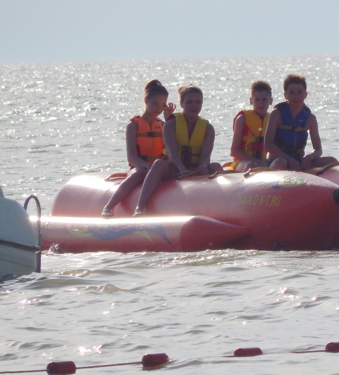 До моря минут 15. До пляжа Каменки. 7 июня уже было очень тепло и вода комфортная. Не прогадали. Мелко долго, для детей идеально. Пляж песчано-глинистый. Дно местами глинистое, поэтому море не прозрачное, но, говорят это полезно. Бананы и ватрушки, батуты, горки имеются.