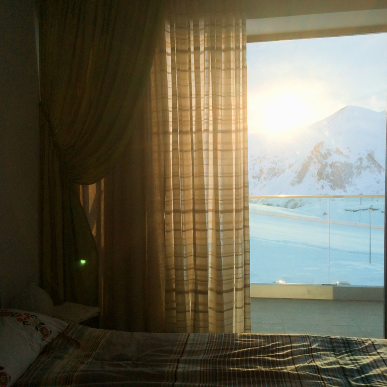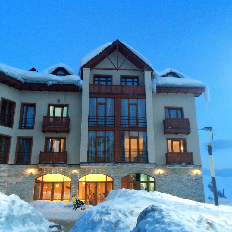 . И вот мы в Тбилиси, там настоящая весна +15С! Затем на машине 2 часа по горам до Гудаури. К сожалению, мы прилетели вечером и не смогли полюбоваться на горы из окна машины, зато видели, как дорогу перебегала лиса). Водитель рассказал, что живности в горах очень много, встречаются и волки, и даже медведи, а уж всяких лис и зайцев море.