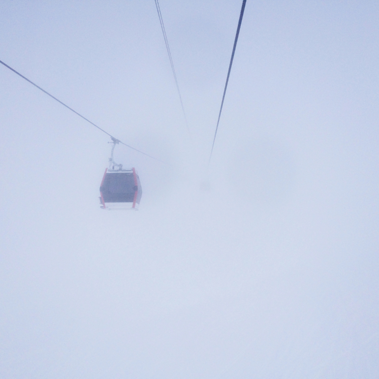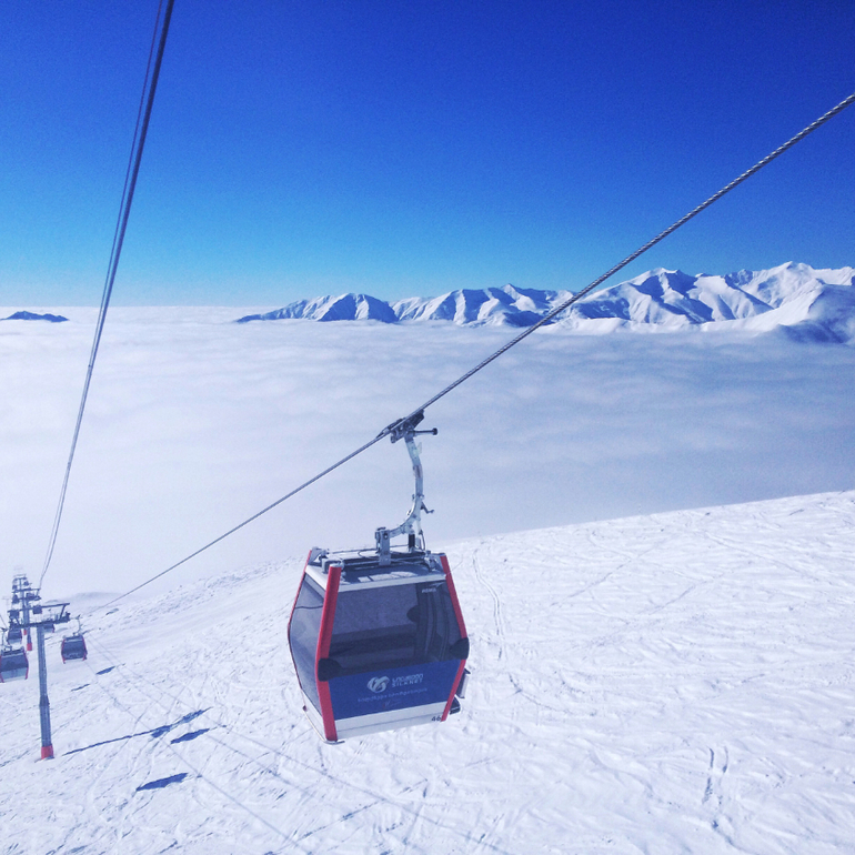 На третий день мы проснулись... в облаках) в прямом смысле) Кругом был такой туман, что вытянутой руки не видно. Расстроились, что в такую погоду ни солнца, ни покатушек нормальных не будет. Муж с Даней уехали наверх, мы с Ромкой остались тусить внизу. Рома в первый же день обзавелся поклонницами среди официанток, продавцов сувенирами, поваров в кафешках и таскал от них шоколад, конфеты, купался во всеобщем обожании и поцелуях) Это он умеет, такой харизматичный мальчик. Со всеми поздоровается, остановится, пообщается) А в это время наверху, оказывается, светило яркое солнце! Когда мы поднялись наверх, увидели эту красоту: облако в долине и ясное небо!