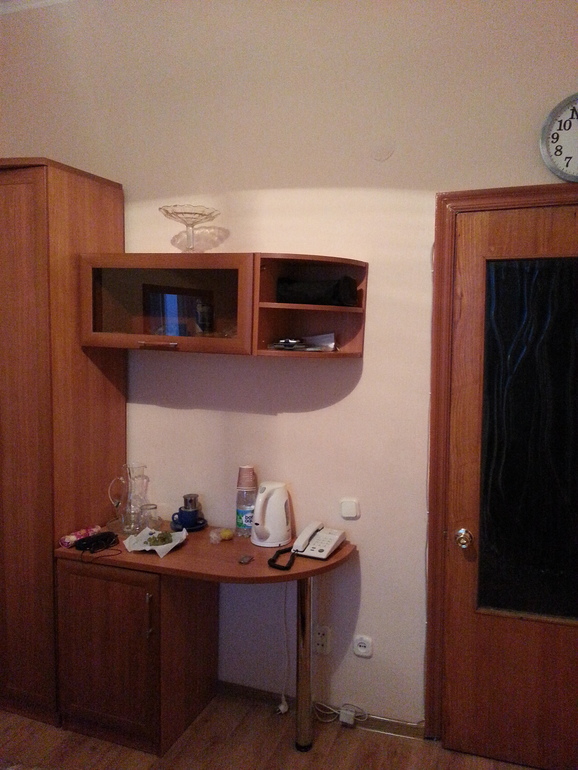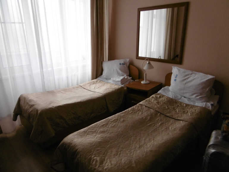Номер обычный ничего примечательного. Мебель не старая (хотя и новой её конечно не назовешь) Две кровати (односпальные, очень узкие, думаю, что полному человеку на такой будет не удобно).Подушки- одеяла синтепоновые. Окна пластиковые, балкон застеклен. Холодильник на балконе( что очень экономило место в номере) Есть минимальный набор посуды( чашки, пара тарелок,столовые приборы) Есть фен( мы пользовались своим) Кондиционера нет. Вытяжка в туалете не работала. Пульт от телевизора не работал, оставляли заявку, за восемь дней так и не поменяли батарейки(. Туалетные принадлежности (гель, шампунь и мыло) Очень хорошие полотенца (белоснежные, мягкие ( по три штуки на человека)). В номере, когда мы приехали было чисто.