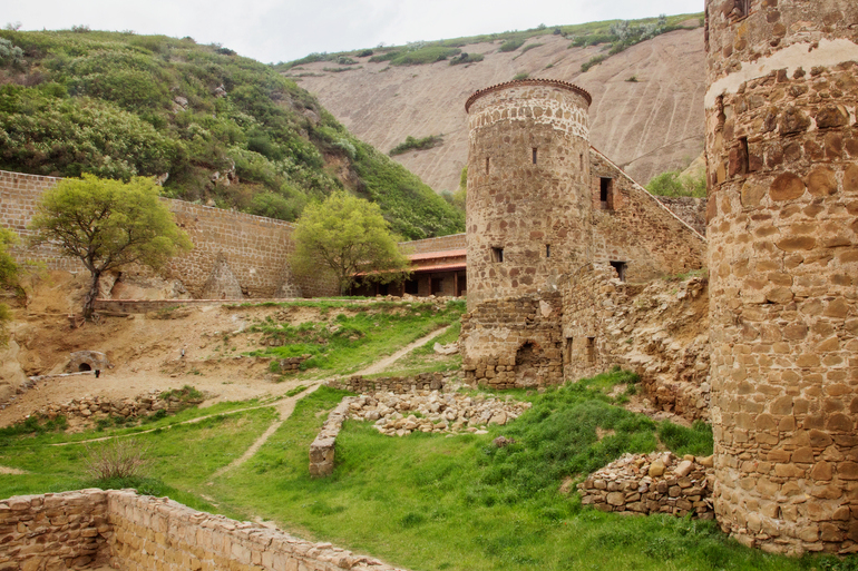 При первом знакомстве с Давид Гареджи более всего впечатляет природный ландшафт, в который совершенно органично вписываются человеческие потуги соответствовать, обживать и покорять все дикое и непохожее на самого человека. Этот монастырь, укрывшийся за высокой стеной и довольно компактный и уютный внутри, действующий - все попытки нечаянно оказаться, где не положено, пресекаются здесь довольно бескомпромиссно.