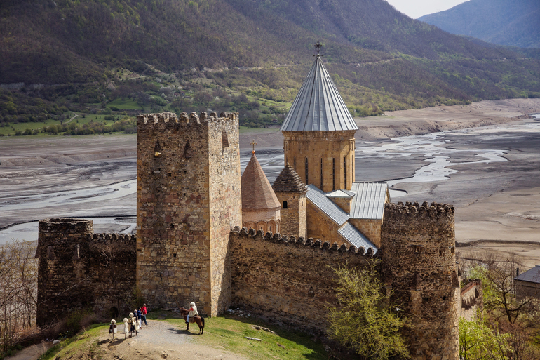 По дороги на Казбеги мы остановились возле замка Ананури - крупный, хорошо сохранившийся замок на берегу Жинвальского водохранилища. Стоит прямо на Военно-Грузинской дороге, это примерно 70 километров от Тбилиси. Это один из самых известных замков Грузии, он упоминается во всех буклетах и путеводителях, сюда часто возят туристов.