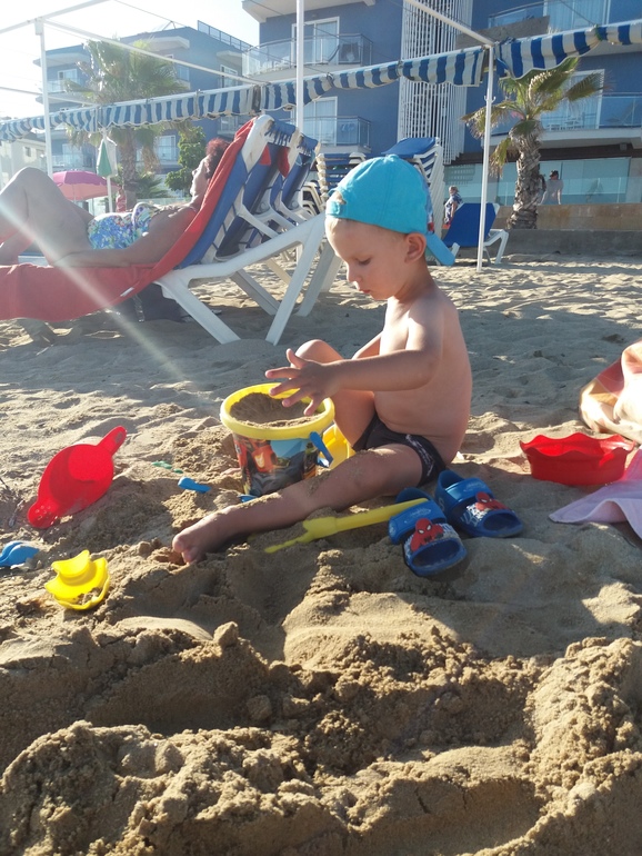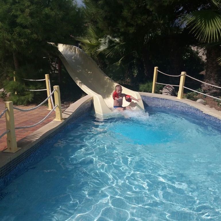 Море соленое, непривычно наше Балтийское еле еле, а тут на Средиземном аж глаза шиплит, вода теплая, так бы и балдел бы на волнах. На след.день ездили в Аквапарк и Дельфинарий, дети первый раз попали на водные горки, ели утошили их