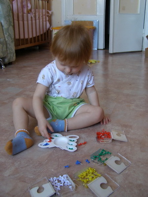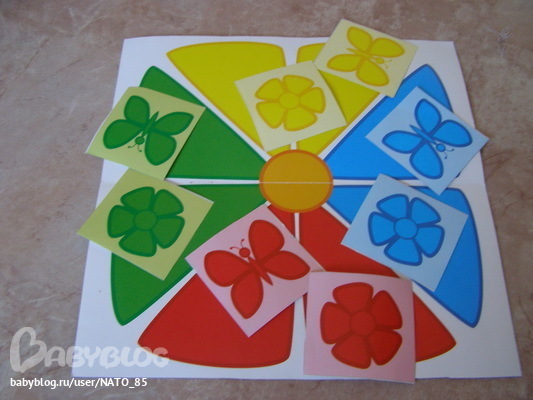 Достали свой заветный цветочек с бабочками и маленькими цветочками. Лиза сразу поняла, что нужно делать и сама без подсказки все правильно разложила. Молодец!