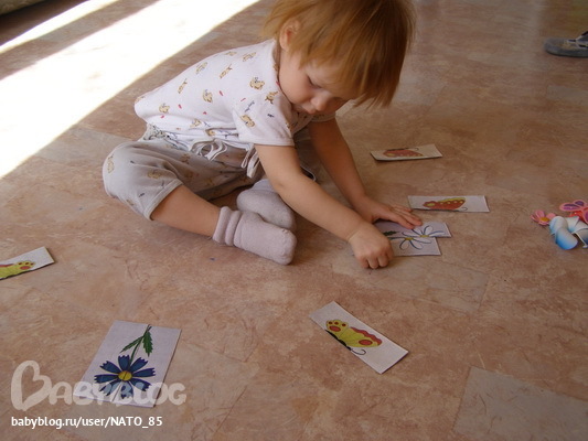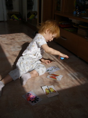 Выбрала из нашей коллекции только по паре цветочков и бабочек. Лиза как обычно все выбирала правильно, правда пару раз путала сторону, но когда ей говоришь, что нужно перевернуть – делает)