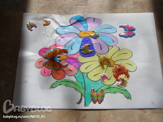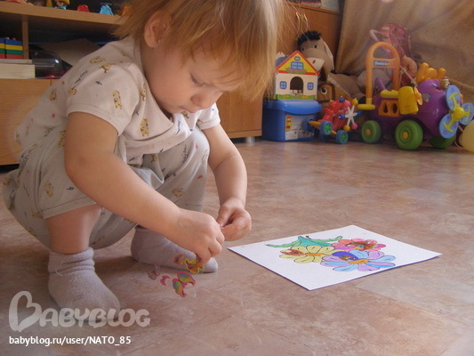Наклеивали наклейки бабочек на цветы. Нашла в интернету рисунок цветочков, разукрасила и Лиза наклеивала бабочек. Я вообще хотела чтобы она не все лепила на цветочек, но и около них ( в полете к ними или уже улетая), но доченька решила что я ее отвлекаю и сама занималась любимым делом.