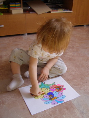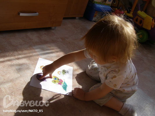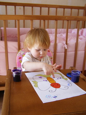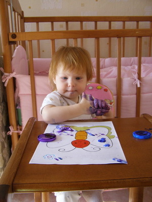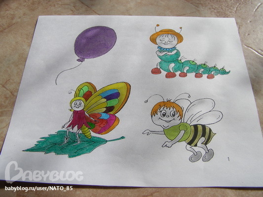 Сделала копию (сфотографировала и напечатала), так как решила посмотреть, что из этого получится. Раскрасила. Лизе сначала показала оригинал, объяснила что нужно делать. Она все прекрасно поняла, даже показала, какой цвет, куда нужно тыкать (голубой верхние крылышки, фиолетовый – нижние).