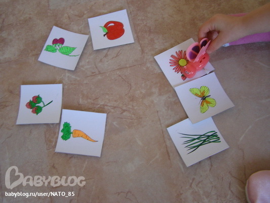 Выбрала несколько вариантов карточек еды и попросила найти то, чем питается бабочка. Лиза решила что кроме цветочка, ей еще и травка понравится. Но нашу гостью посадила на цветочек!