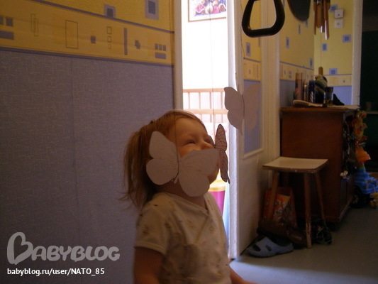 Почему именно ее? Даже не знаю, может потому, что на дворе весна и хочется солнышка, тепла, цветочков, бабочек и т.п. Доченька бабочек очень любит, у одной из бабушек целая коллекция – вся кухня, сплошные бабочки. И кафель, и магниты, и рамки засушенными и подставки…. У нас, конечно, дома такого количества не оказалось, но мне кажется, что дочурке понравилось!