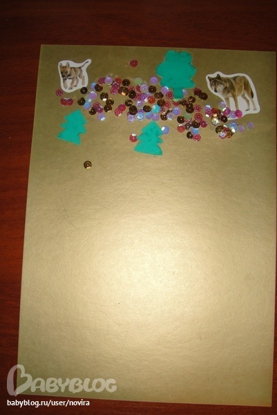 На лист картона приклеили наклейки волка и волчонка. Я нарисовала контур извилистой дорожки и попросила Марьяну ее намазать клеем, потом выложили ее паетками (хотела чечевицей, но в доме не оказалось, было бы больше похоже на дорожку). Из зеленой самоклейки вырезала дерево и елочку, дочка «посадила» их вдоль дороги. В дальнейшем планирую добавить дорожки между другими звериными семействами (мама-малыш).