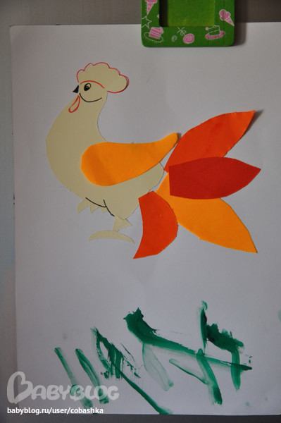 На прошлой неделе мы начали занятия в школе развития "Перспектива". Первое занятие было посвящено петушку. Дети пели песенку про курочку, делали гимнастику для ручек, показывали как курочка клюет, затем собирали яйца от киндер сюрприза в большую банку, клеили аппликацию "Петушок", рисовали травку пальчиками, в конце занятия просто играли игрушками, лазили в сухой бассейн, ходили по сенсорной дорожке. В целом занятие мне понравилось, кроме того, что Егор начинал плакать, когда педагог включала громко (это для Егора громко) музыку.
