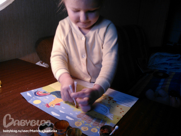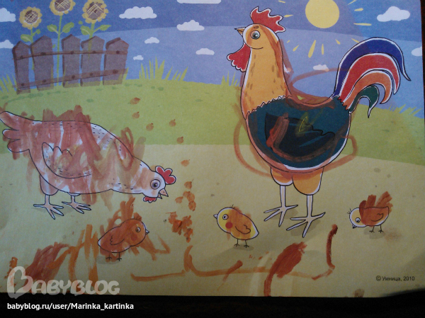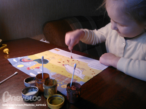 На втором листочке хотела предложить слепить зернышки из пластинина, но дочурка отправилась в свободное художество. Вот что получилось (это все ватные палочки):
