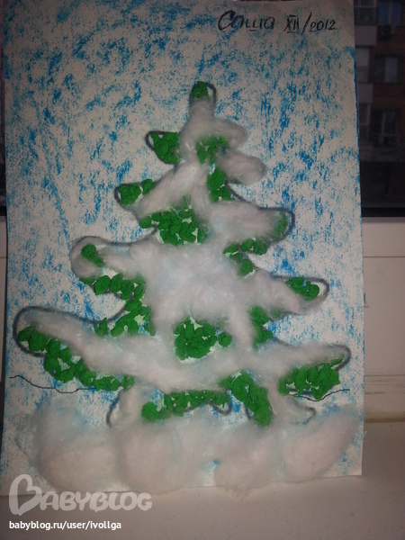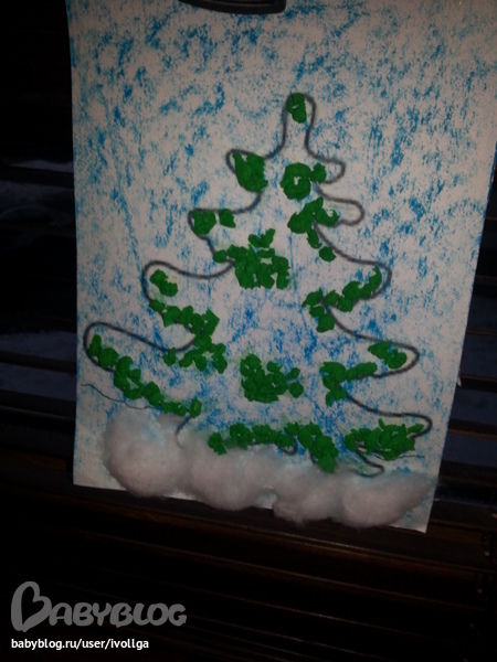 Елочка была нарисована на листе и части веток были выделены цветом (то что в последствии стало зеленым)