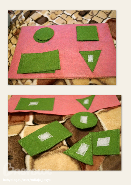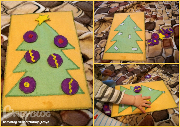 Сначала сшила деталь с геометрическими фигурами, но фетр слишком тонкий и отрывать фигурки неудобно. Решила сшить еще елочку, между собой их сшила (лист с геометрическими фигурами и лист фетра с елкой), а внуть вставила твердый картон, теперь играть удобно.