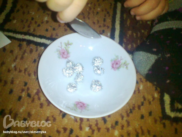 самое увлекательное занятие на сегодня оказалось следующее-я "накатала"из фольги "снежинок",(на улице Ужасная Метель, сидели дома!)мы их катали, швыряли, дули, обсыпались