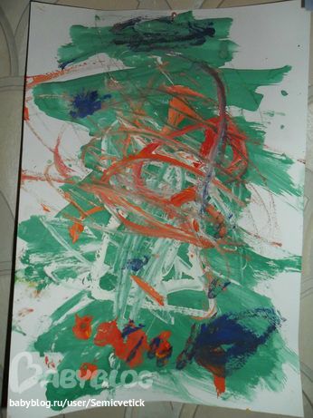 А такая ёлка останется нам, здесь я никакой заготовки не делала, только предложила дочке нарисовать ёлку и подавала краски (сначала зеленую, потом остальные - если дать сразу все, то получился бы буро-коричневый лист). Оказывается Ксюша умеет рисовать круги и овалы, на рисунке уже не видно, но так интересно она линии закругляет. Ёлка у нас получилась вся в серпантине
