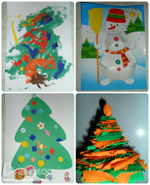 В эти дни мы с дочкой делали открытки на подарок родным - делали аппликации и рисовали. Я заранее подготовила основу для аппликаций и вырезала детали, для рисунка нарисовала контуры ёлки. Снеговика помогала и вместе сделали еще одну ёлочку из креповой бумаги.