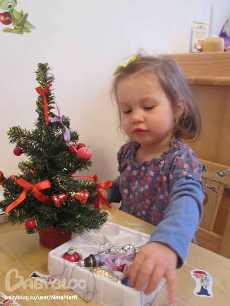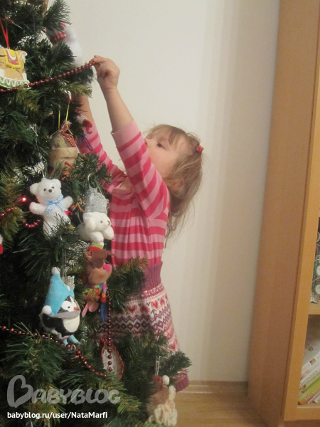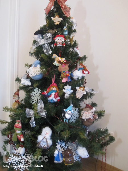 Нарядили большую елку. В этом году плюшевыми игрушками. Я их купила, хотя конечно такие можно сшить самим. Просто мне кажется с такими интересно ребенку и не страшно разбить.