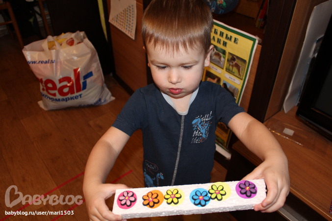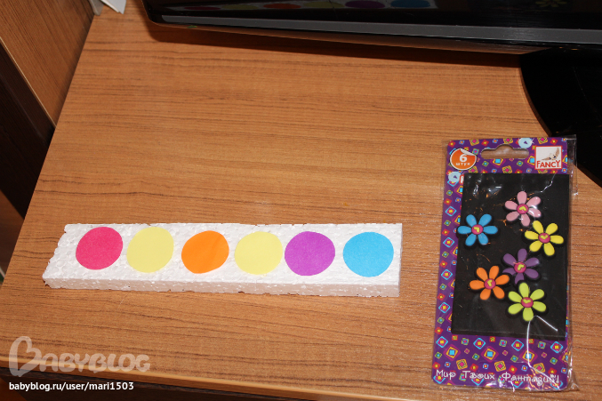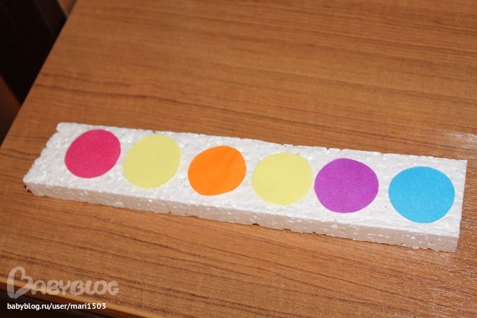 Взяла кусочек пенопласта, вырезала разноцветные кружочки. Задание и без слов понятно - вставить кнопки в кружок соответствующего цвета.