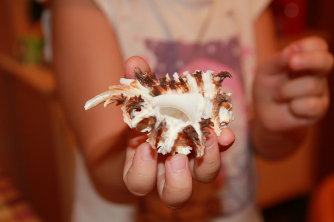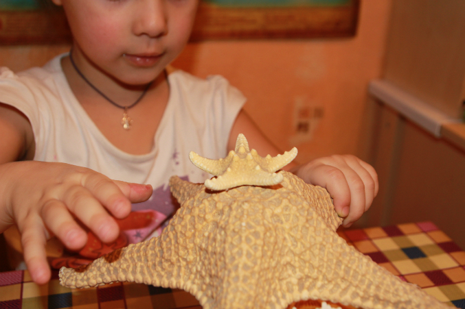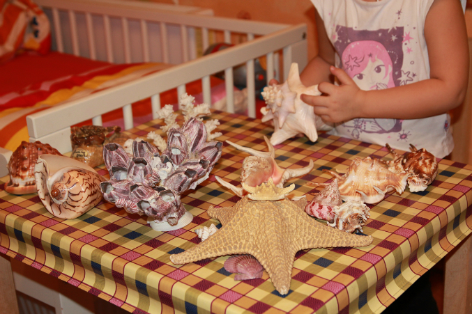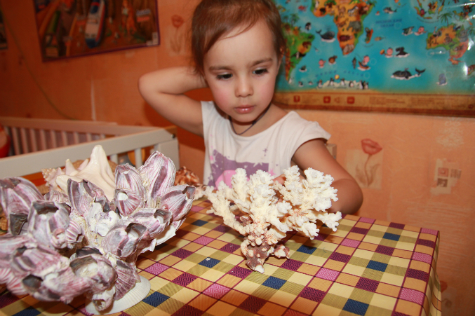 Далее СЮРПРИЗ для Насти. Настоящие ракушки, кораллы, морские звезды и даже крабик!!! Раковины различные, и большие и маленькие, из морей и океанов! Их очень много у меня, даже не все доставала в этот раз.