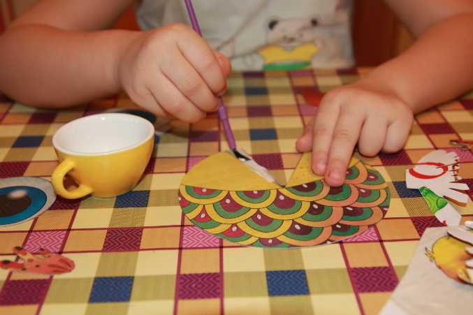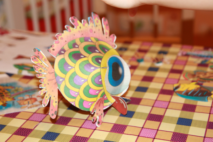 А это чудо-рыбка. По другому назвать ее не могу. Она странная получилась. Это из какой то газеты, для плотности наклеила на плотную бумагу и уже потом вырезала части. Настя активно наносила клей ПВА кисточкой, а потом пришлось мне заканчивать весь процесс.