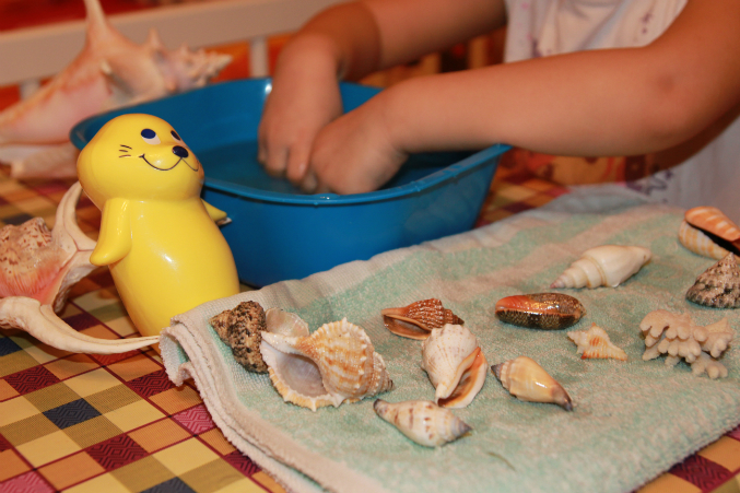 А в тазик решили положить маленькие ракушки, они тоже очень красивые и все разные, и еще камешки.