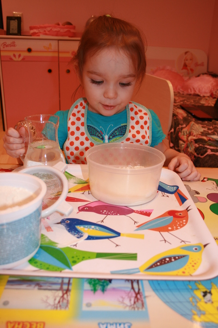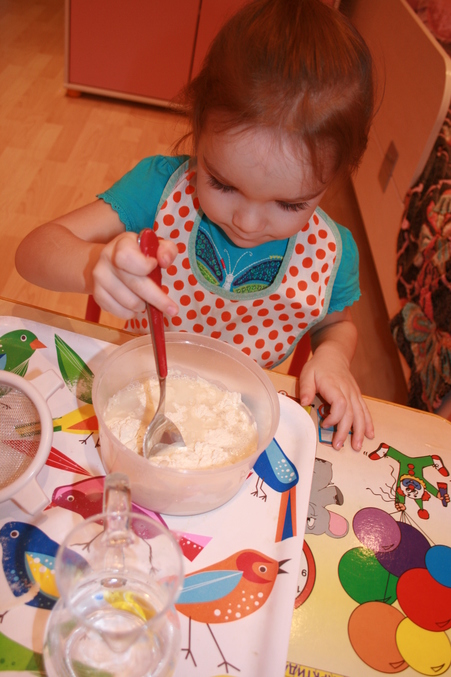 А дальше мы замешивали тесто: просеивали муку и переливали водичку, замешивали ложкой.
