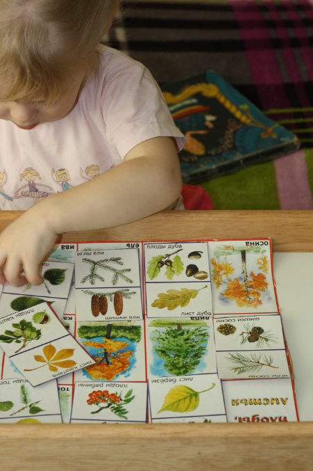 Искали соответствия. Листья - деревья. Скажу сразу, что не все плоды/листья деревьев Соня знает. Обязательно вернемся, проведем тн