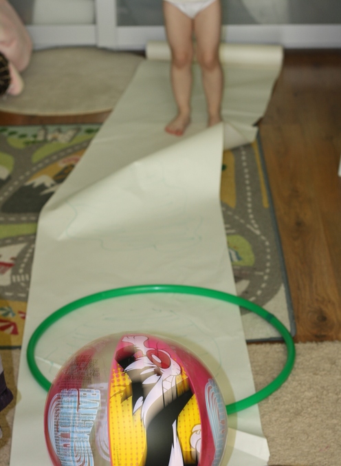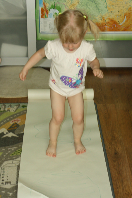 Нарисовала на рулоне лужи. Задача Сони - перепрыгивать. Дочка так разошлась, что скакала туда-сюда-обратно минут 30 )))) Конечно, не всегда при этом их перепрыгивая. Разгонится, и пошла ))))) Идея - @Suvimaca