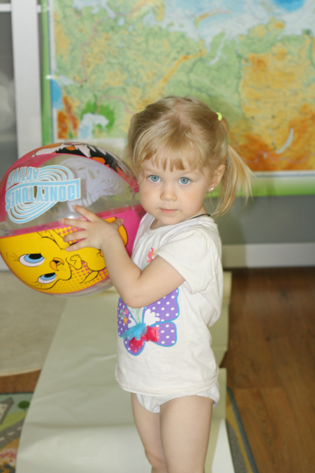 Бросали мяч. Тренируемся в ловкости. Воообще, честно сказать, Соня не всегда ловит его, не удается. Надо работать в этом направлении, ведь это тоже очень важно