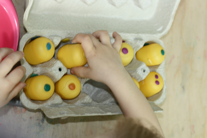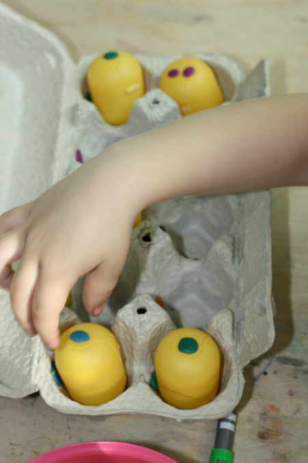 Разложи по образцу. Примером служила коробка из под яиц с наклееным в нее пластилином. Аналогичные точки/цвета были на киндерах. Даже не успела объяснить что к чему, Соня быстренько разложила в правильном порядке все киндеры. Вот ведь молодец )))