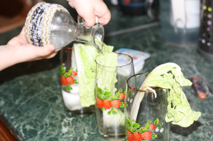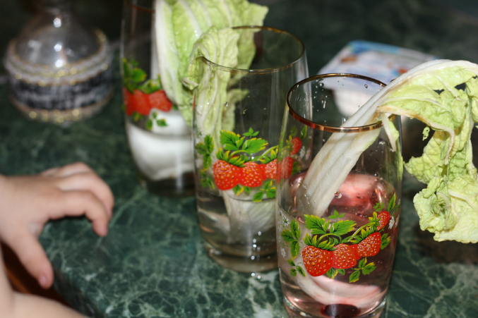 Начали мы наше занятие с опытов. Поместили листы китайской капусты в стаканы, залили водой и бросили туда красители. Но, поскольку, на красителях написано, что туда нужно наливать еще уксус, сомневалась в том, что эффект будет. Но я ошибалась! Он есть! Уже сейчас листы окрашены в разные цвета. Дочка очень обрадовалась, понравилось ей наливать воду, а еще больше - бросать таблетки-красители )))))