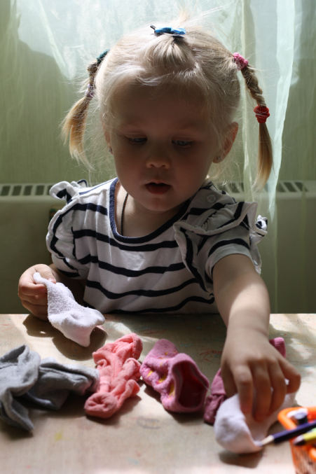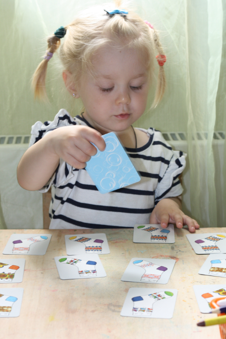 Играем в игру - большая стирка. Много карточек не предлагаю, по чуть-чуть раскладываю. А задача Сони - найти пару носок (или все же носков? )