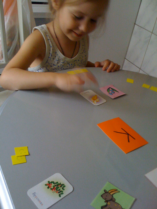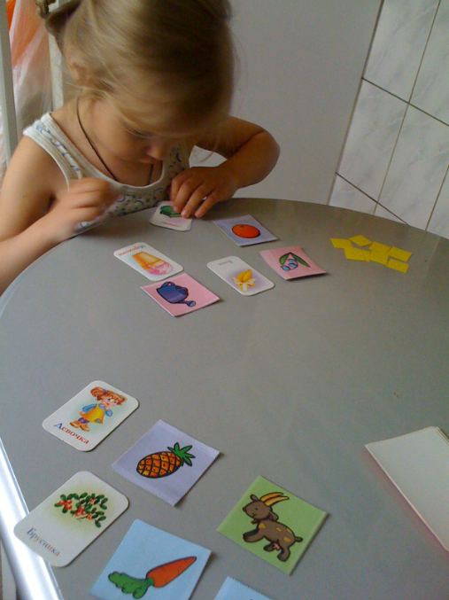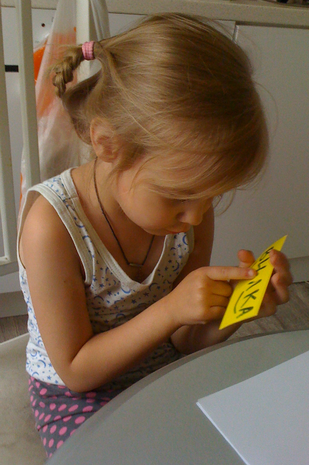 Написала на квадратах буквы разные и подобрала по паре картинок начинающихся на эти буквы. Раздала картинки себе и Ясе. Поочередно клала на стол по букве и кто быстрей найдет у себя картинку на эту букву получает смайлик.